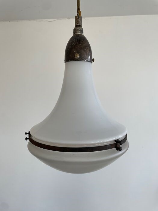 Alle metalen delen zijn compleet en origineel. Opnieuw bedraad en geleverd met originele ketting. Deze Luzette lamp is in perfecte vintage staat. Peter Behrens is een van de meest invloedrijke Duitse ontwerpers van de 20e eeuw. Peter Behrens was een vooraanstaande Duitse architect en industrieel ontwerper en voor velen de vader van modern industrieel ontwerp. Vooral bekend om zijn vroege baanbrekende AEG Turbine Hall in Berlijn in 1909, had hij een lange carrière, waarbij hij objecten, lettertypen en belangrijke gebouwen ontwierp in een reeks stijlen van de jaren 1900 tot de jaren 1930.