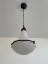 Luzette Plafondlamp van Peter Behrens voor AEG, jaren 1910. Deze lamp is geheel origineel met een mooie combinatie van een opaline glazen bovenkap en een matglazen onderkap. De glazen kap is genummerd en gemerkt (zie foto's).