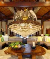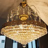 De structuur is verguld met goud en versierd met prachtige gravures.De bovenste kroon geeft bronzen draden af die zijn versierd met prachtige geslepen glaskralen in prisma en veelzijdige amandelvorm. Centrale kroon is breed 50cm breed, hij is versierd met motieven, achthoekige glaskralen die het mooie design van de lamp vormen. Het is een ideaal fanatiek stuk voor decoratieliefhebbers, een volledig veelzijdige lamp die voor grote elegantie zorgt en een gezellig en weelderig gevoel voor het oog creëert dankzij de kristallen die kleuren afgeven die de kamer weerspiegelen.