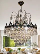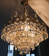Deze prachtige plafondlamp is ronduit spectaculair. Een oud stuk zal de omgeving stralen, alle kristallen zijn schoon, alle centrale bedrading en alle lamphouders zijn herzien, ondanks zijn jaren behoudt het alle elegantie en originaliteit van een verfijnde kroonluchter, het heeft een lichte structuur , die is versierd met een mooie druppel glaskralen, in diamantvorm, de kronen versierd met motieven, het is gekleed in gelaagde amandelvormige glaskralen.