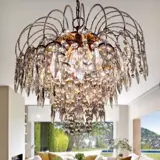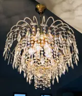 Een prachtig ontwerp in trapsgewijs formaat, ze geven gouden draden af, bedekt met kleine glazen bolletjes, ze bevatten majestueuze kralen van grote geslepen kristallen, achthoekige kristallen en pijlvormige kristallen. Projecteert grote helderheid, helderheid en kleuren voor de omgeving.