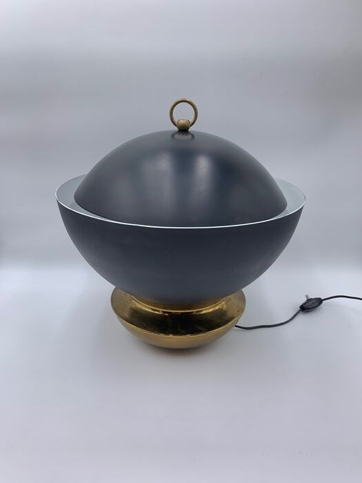 Een zeldzame en grote Italiaanse designlamp uit de jaren 50 met gereflecteerd licht in zwart geëmailleerd metaal en messing voet.
