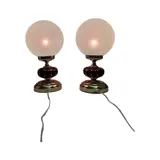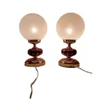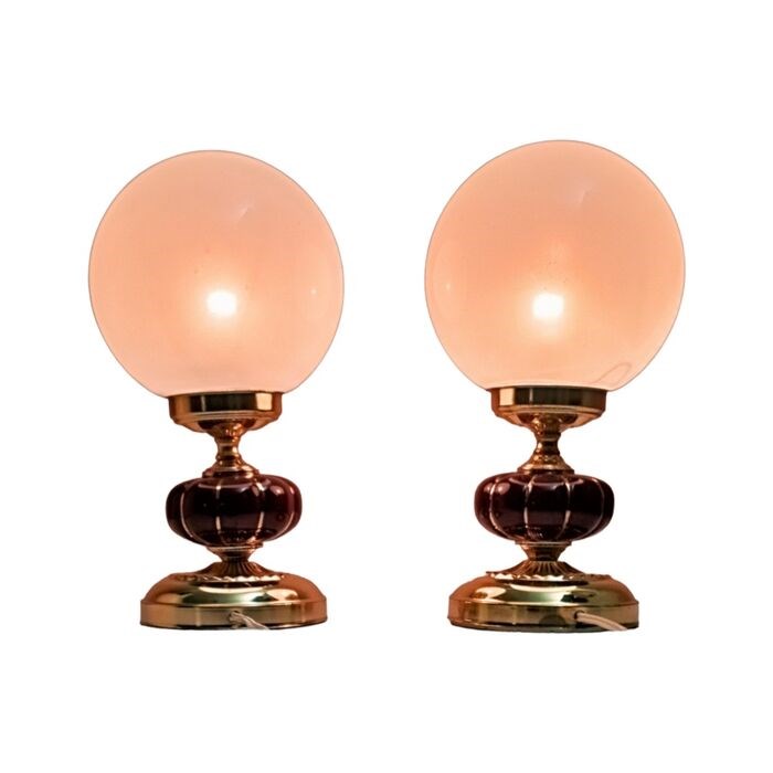 Prachtig paar lampen met ondoorzichtige glazen bollen gemonteerd op een goudkleurige metalen voet en met een in segmenten verdeelde granaatversiering.