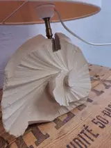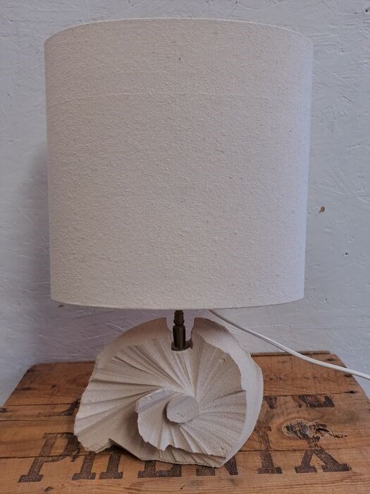 Prachtige lamp uit de jaren 70 in natuurlijke kalksteen uit het zuiden van Frankrijk. Het is uitgehouwen in de vorm van een ammonietfossiel. De lampenkap is afneembaar, vintage en gemaakt van natuurlijk materiaal. Van het mooiste effect!