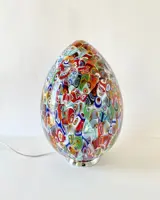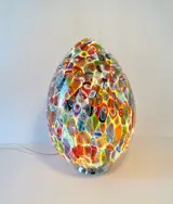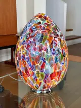 Een explosie van kleuren in deze ongelooflijke en kostbare Murano-lamp. Het is gemaakt met oneindig veel kleine glastegels genaamd "MURRINE", elke afzonderlijke murrina heeft verschillende motieven en kleuren, deze worden vakkundig gesmolten, door de meesterglasmaker, op een massa melkachtig glas, en dan, door blazen, zal het de vorm aannemen van een ei deze prachtige lamp.