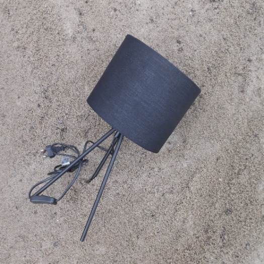 Deze driepoot tafellamp heeft poten van zwart metaal en een lampenkap in dezelfde kleur.