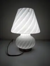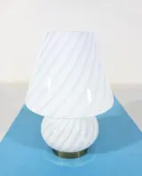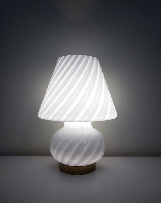Schitterende tafellamp uit de jaren 60/70 in handgemaakt Murano-glas in een schaduwwitte kleur met een gedraaid patroon en een verchroomde stalen voet, zeer mooi design en lichtgevend effect, object in goede algemene staat, klein en mooi ouderdomspatina op het oppervlak. gaaf glas. Hoogte 28cm.