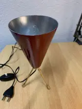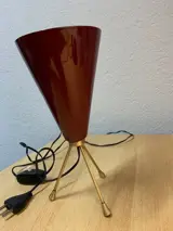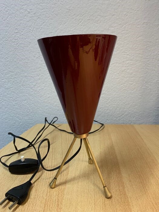 Kegelvormig statief uit de jaren 50, drie pootjes in gesatineerd messing, kegel in bordeauxkleurig aluminium van Italiaanse makelij, de elektrische kabel is vervangen volgens de CE-normen, de originele stekker en lampschakelaar.