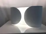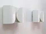 Wandkandelaar, direct/indirect/gedeeltelijk diffuus licht. De wandbevestiging is van gesneden, gevouwen en gepoedercoat staal, in een glanzend witte kleur. Lampenkap in gesneden, gebogen en gepoedercoat staal. De twee lamphouders zijn gemaakt van wit spuitgegoten nylon.