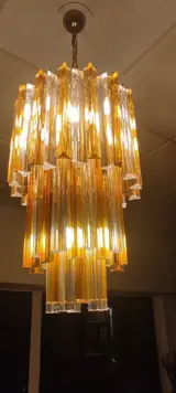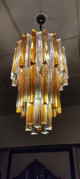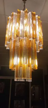 Trilobi kroonluchter, samengesteld uit drie cascades van 60 transparant en amberkleurig geblazen glas die een kleurharmonie creëren in de ruimte waarin hij wordt opgehangen, indien gewenst kan de manier van verplaatsen worden gewijzigd om de omgeving te personaliseren, 60 glazen met een bovenste haak om op te hangen en elk weegt ongeveer 350/380 gram om de structuur van de kroonluchter toe te voegen.