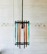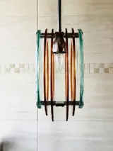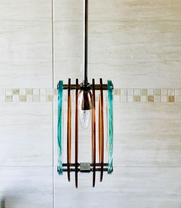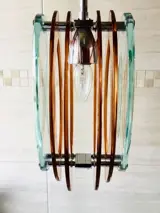 Prachtige hanglamp van Veca in dik Nijlkleurig glas en amberkleurig glas.