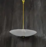 Grote rationalistische hanglamp met structuur in gepolijst messing en crande in "reticello" glas, monteert 3 lampen met kleine E14 fitting, doet denken aan enkele van de eerste modellen gemaakt door Luigi Fontana maar er zijn geen handelsmerken of zelfklevende labels.
