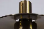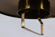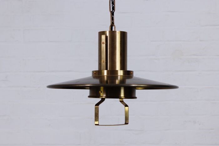 Mooie en stoere mid-century hanglamp van Vitrika in Denemarken. De stijl is nautisch/maritiem en past in elk modern interieur. De lamp is bevestigd via een ketting en een gepatineerde kap, eveneens van messing.