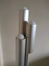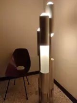 Jaren 70 vloerlamp _ space age. In gesatineerd aluminium en glanzende band onderaan, met 6 lichtpunten en dubbel knoppenpaneel om het boven- of ondergedeelte in te schakelen. Onderliggende ballast van 40 kg. over.
