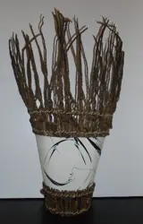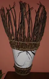 Grote wandlamp (staande ook mogelijk) en takken zijn met touw met elkaar verbonden.