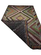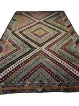 Deze unieke handgeweven vintage kelim is gemaakt in de jaren 70-80 door nomaden in het dorp Usak. Voordat ze met het weven begon, was de wever haar schapen aan het scheren, de wol aan het schoonmaken, kammen en spinnen om het beste garen van kilim te hebben. Tapijten weven is een traditie in Turkije en elk dorp en elke stam heeft een andere ontwerp- en weeftraditie. Dit vloerkleed heeft een karakteristieke combinatie van kleuren en design.