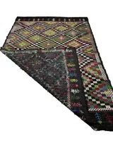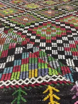 Deze unieke handgeweven vintage kelim is gemaakt in de jaren 70-80 door nomaden in het dorp Usak. Voordat ze met het weven begon, was de wever haar schapen aan het scheren, de wol aan het schoonmaken, kammen en spinnen om het beste garen van kilim te hebben. Tapijten weven is een traditie in Turkije en elk dorp en elke stam heeft een andere ontwerp- en weeftraditie. Dit vloerkleed heeft een karakteristieke combinatie van kleuren en design.