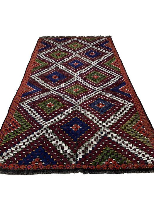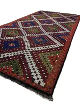 Deze unieke handgeweven vintage kelim is gemaakt in de jaren 70-80 door nomaden in het dorp Usak. Voordat ze met het weven begon, was de wever haar schapen aan het scheren, de wol aan het schoonmaken, kammen en spinnen om het beste garen van kilim te hebben. Tapijten weven is een traditie in Turkije en elk dorp en elke stam heeft een andere ontwerp- en weeftraditie. Dit vloerkleed heeft een karakteristieke combinatie van kleuren en design.