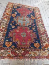 Beautiful Caucasian carpet from the village of Tovuz, with the classic Lesghi star Kazak design. 1930s. It is interesting that the pile of the carpet is not cut back at the two ends. This frames the carpet. The carpet is in relatively good condition. Its dimensions are 165 cm x 110-106 cm. Errors may occur. It requires restoration. Because of its unique ends, it is a collector's item!-