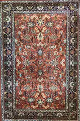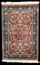 Perzisch vloerkleed van wol en zijde, fijngeknoopt, bloemdessin met felle kleuren met de hand geknoopt uit het begin van de jaren 1800. Het klassieke motief met warme kleuren maakt het tot een elegant vloerkleed met een geweldig scenisch effect.