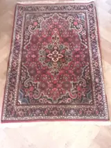Handgeknoopt, zwaar, perzisch tapijt uit Iran. 145x102 cm. Knoopdichtheid 360.000. Kleuren: Rood, blauw en beige.