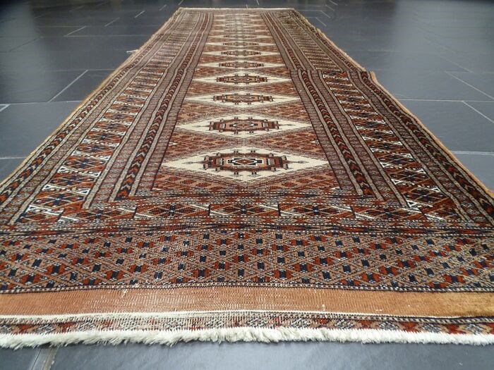 Turkestan is het land van de Oezbeken. Bukhara is de commerciële haven waar deze tapijten worden verhandeld. In Buchara zelf is er geen weefgetouw. Deze tapijten worden vandaag de dag nog steeds door families gemaakt. De basisstof bestaat uit wol gedraaid met geitenhaar. Voor het knoopmateriaal dat de pool vormt, wordt een stevige kurkwol gebruikt. Beide materialen worden vandaag de dag nog steeds met de hand gesponnen. het rood is gekleurd met meekrapwortel.