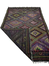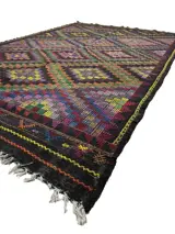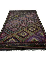 Deze unieke handgeweven vintage kelim is gemaakt in de jaren 70-80 door nomaden in het dorp Usak. Voordat ze met het weven begon, was de wever haar schapen aan het scheren, de wol aan het schoonmaken, kammen en spinnen om het beste garen van kilim te hebben. Tapijten weven is een traditie in Turkije en elk dorp en elke stam heeft een andere ontwerp- en weeftraditie. Dit vloerkleed heeft een karakteristieke combinatie van kleuren en design.