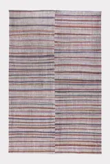 Pala Kelim vloerkleed. Een eenvoudig, oud tribaal vloerkleed, gemaakt voor alledaags gebruik, met een levendig, verrassend kleurenpalet. De weeftechniek en het gebruik van gemengde materialen van het vloerkleed met een zeer interessante textuur.