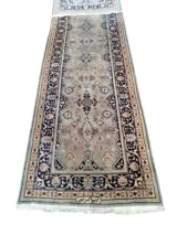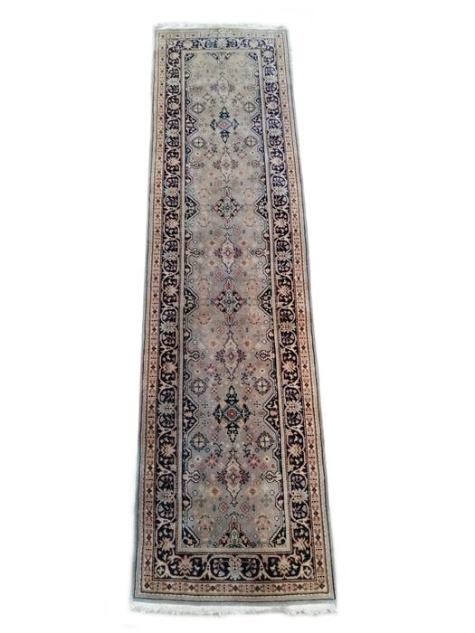 Bella Corsia Erivan knoopte in Roemenië vanaf de jaren 70 van de vorige eeuw, waar het Roemeense regime van die tijd, om aan de sterke vraag naar tapijten te voldoen om er een bron van inkomsten van te maken, productiefaciliteiten opende die, hoewel ze geen originele ontwerpen hadden, maar de Perzische had groot commercieel succes mede dankzij het feit dat er goede Perzische wevers werden ingehuurd. Tapijt geproduceerd in de jaren 70, in uitstekende staat, wol op katoen, goede materialen, beloopbare wol, robuust, bijna onverwoestbaar tapijt. 325x87 cm.Klassieke Perzische bloemenplant, lichtblauwe achtergrond geoxideerd door de tijd, plantaardige kleuren.