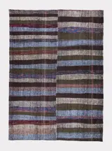 Een oud platgeweven vloerkleed uit Zuidoost-Turkije, geweven in twee panelen op een smal weefgetouw, met verticale en horizontale lijnen die tegen elkaar spelen. Geweldige patina en verbazingwekkende kwaliteit weefsel.