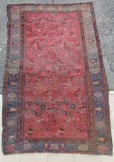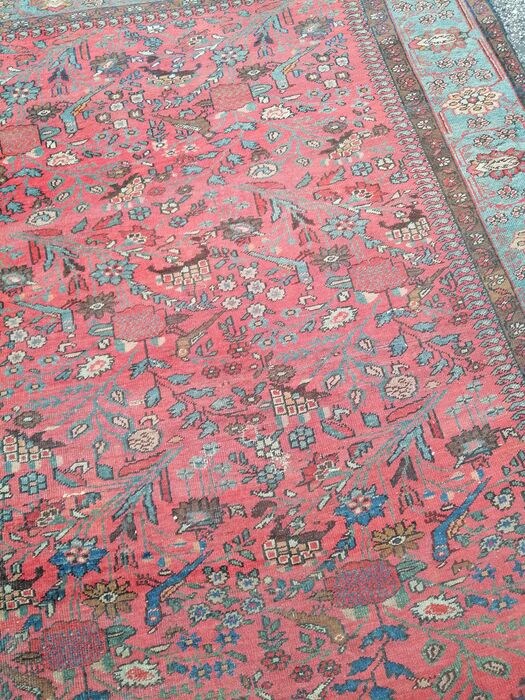Zeldzaam oud Perzisch Ferahan Sarouk-tapijt, hoewel het in dit geval veel ouder is dan de Amerikaanse periode, is het juist om het Arak - Ferahan te noemen, geknoopt in de tweede helft van de 19e eeuw, logisch plantaardige kleuren, roze achtergrond geoxideerd door de tijd. Vrij veld iconografisch systeem met klassieke tekeningen uit die periode, daarna veranderd met de Amerikaanse periode. Het tapijt is antiek maar heeft restauratie nodig. 207x127 cm. Het stuk, zoals te zien op de foto, is niet perfect recht, dit verklaart ook het niet-commerciële gebruik van degene die het heeft geknoopt. Geïmporteerd vóór 2015
