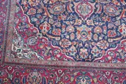 Dit antieke handgemaakte Perzische Kashan wollen vloerkleed uit het begin van de 20e eeuw stelt geen enkele potentiële koper teleur met zijn weefkwaliteit en decoratieve uiterlijk. Met afmetingen van 200 x 133 cm (6'6"x4'4"), heeft het een opvallend centraal medaillon versierd met gedetailleerde bloemmotieven en bladeren in een nachtblauw veld, omsloten door smalle randen op een rode achtergrond. Afgezien van zijn verbazingwekkend mooie uiterlijk, is het ook in een zeer goede algehele staat met de consistente pool- en shimmy-kleuren.