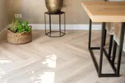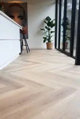 Een prachtige Walvisgraat vloer gerealiseerd uit PVC van het vloerenmerk Floer. Deze vloer dient te worden geplakt aan de ondergrond.