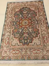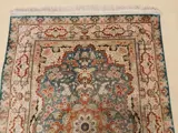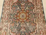 Het is een antieke Perzische zijden Ghoum. Met zeer mooie en zeldzame groene kleur. De combinatie van design en kleuren is zeer aantrekkelijk en bijzonder. Het is in perfecte staat. Altijd aan de muur gehangen en nooit op de grond gebruikt. Vanwege de leeftijd is de natuurlijke groene kleur aan de voorkant lichter dan aan de achterkant. Het is heel fijn en heeft bijna een miljoen knopen per vierkante meter.