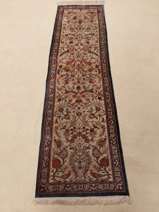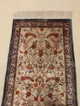 Het is een heel mooi zijden Ghoum tapijt. Het is gemaakt door een zeer bekende Perzische tapijtontwerper en is gesigneerd door Ghoum Amiri. Het is gewassen en sommige kleuren zijn licht gemengd. Het is zeer fijn geknoopt 10x10 bijna een miljoen knopen per vierkante meter. De combinatie van design en kleuren is zeer aantrekkelijk. Kijk naar de foto's.
