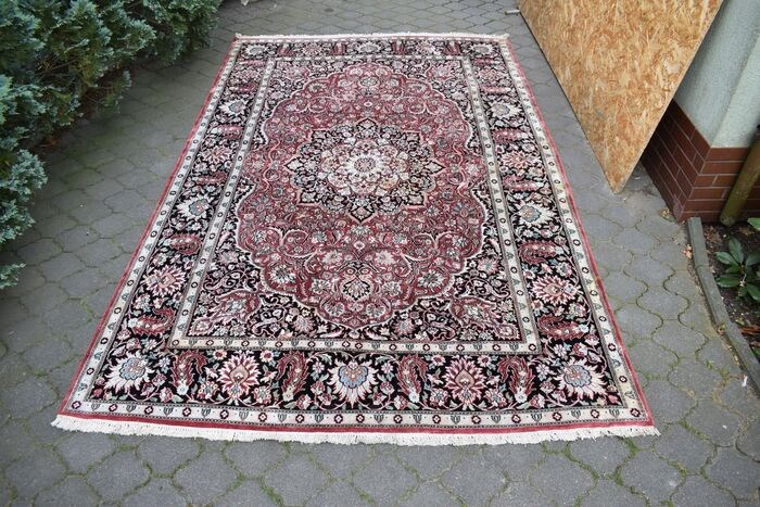 Hoogwaardige en buitengewone schoonheid, origineel en exclusief Perzisch vloerkleed Ghoum handgeweven en gemaakt van de hoogste kwaliteit Zijde op zijde bloemen contouren worden benadrukt en gevuld met zijdedraad met een kort gesneden, glanzend vlies. Het tapijt wordt bevestigd door een certificaat van kwaliteit en oorsprong. Oosters design, een indrukwekkend medaillon omgeven door prachtige bloemstukken en harmonieus contrasterende kleuren zorgen ervoor dat het er heel mooi en waardig uitziet wanneer het wordt uitgevouwen.