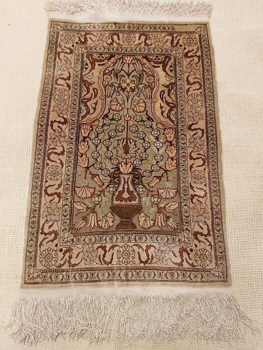 Het is een zeer zeldzaam en mooi Turks zijden Hereke tapijt. Het is gesigneerd Hereke. Het vloerkleed is gemaakt van zijde en wat metaal op zijde. Het is een heel mooi fijn tapijt bijna een miljoen knopen per vierkante meter (10×10). Het heeft een zeer aantrekkelijke combinatie van ontwerp en kleuren.