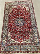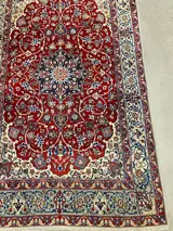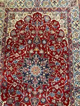 Prachtig handgeknoopt tapijt van wol. De zijde is op een natuurlijk manier geverfd zonder chemicaliën De hoofd kleur is Rood cream Blouw.