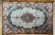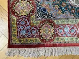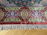 Zijden vloerkleed in perfecte staat. Mooie tinten blauw, roze en rood. Ongeveer 20 jaar geleden geïmporteerd uit Iran.