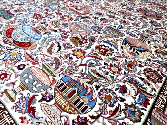 Het vloerkleed is recentelijk vakkundig en speciaal gereinigd volgens de traditionele biologische methode en kan direct worden neergelegd. met een zijdeachtige glans.