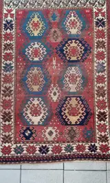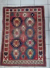 Uitzonderlijk antiek Kazak Kazak Bordjalu tapijt geknoopt in het midden van de 19e eeuw, deze tapijten werden geknoopt door Borciali Kozakken in het dorp Bordjalu en in Ciobanck ten zuiden van Tiflis bij Lambalo. Ze worden voornamelijk gekenmerkt door een rigoureus geometrische lay-out zoals zuigtabletten, haakvormige zeshoeken. Deze tapijten zijn meestal zeer levendig en iconografisch vol, het exemplaar dat wordt bekeken heeft bovendien een antropomorf element dat het uniek maakt. Wol op wol, plantaardige kleuren, het tapijt is in uitstekende gerestaureerde staat, het is schoon, 180x123 cm, maakt deel uit van mijn persoonlijke collectie.