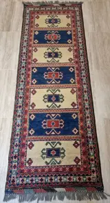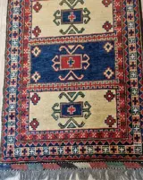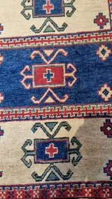 Een zeer mooi wollen vloerkleed geïnspireerd op Russische Kazachse ontwerpen, dit vloerkleed is nieuw en nooit gebruikt.
