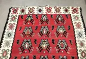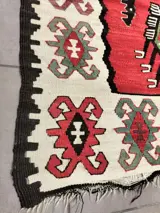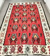 Oosterse Kelim. handgemaakt. Wol . Gebruikt in goede staat met enkele gebruiks- en ouderdomssporen. Afmetingen: 200x132cm.