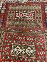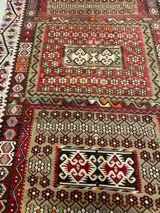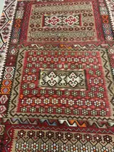 Prachtig handgeknoopt kelim van wol. De wol is op een natuurlijk manier geverfd zonder chemicalien. De hoofd kleur is.creme.Rood.zwart.