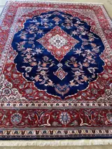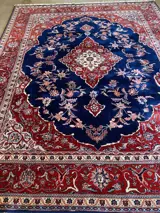 Prachtig handgeknoopt tapijt van wol. De katoen is op een natuurlijk manier geverfd zonderchemicaliën.De hoofd kleur isDonker blouw cream RoodGroen