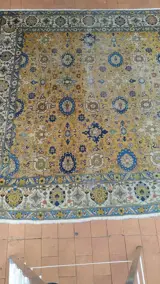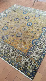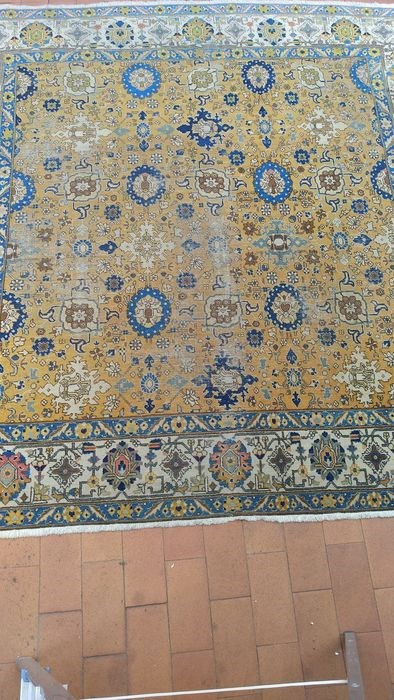 Khorasan Perzisch tapijt ketting- en inslagkatoenwol. Gebruikssporen, maar over het algemeen in goede staat. Lengte 255cm, breedte 240cm. Gewicht 20kg. Mosterd kleur.