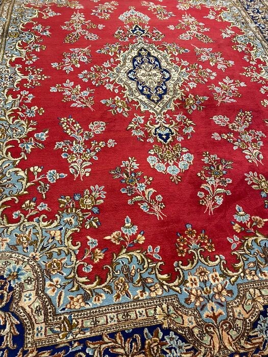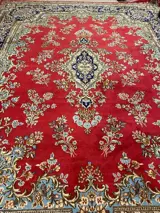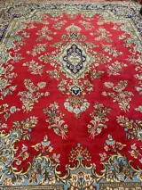 Prachtig handgeknoopt tapijt van wol. De katoen is op een natuurlijk manier geverfd zonderchemicaliën. De hoofd kleur is Rood cream Blouw Groen