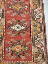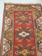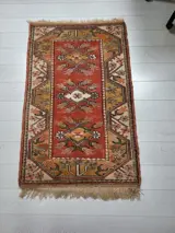 Een Turks Milas handgemaakt wollen vloerkleed van 122 x 83 cm (3 x 2,7 ft). Een paneel met ruitvormige motieven in rood veld met soortgelijke objecten in witte en groene randen. Goed kleurend en hoogpolig Milas vloerkleed dat professioneel gereinigd en gewassen is met beide uiteinden vastgezet.