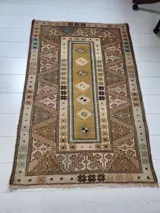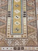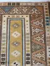 Een prachtig handgemaakt wollen Turks Milas tapijt circa 1970 van 133 x 93 cm (4,3 x 3 ft). Middenpaneel gedecoreerd met ruitvormige objecten met buitenpanelen met het gelijkaardige veld in pastelgele, groene, blauwe en bruine kleuren. De zacht aanvoelende wol en het fijne weefsel geven aan dat het tapijt van het fijne Milas-type is met meer kenmerken en design voor kunstnijverheid. Kleuren zeer aantrekkelijk en vloerkleed is in goede staat. Het is professioneel gereinigd en gewassen met beide uiteinden vastgezet. Prachtig decoratief stuk.
