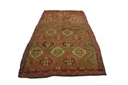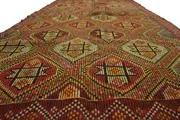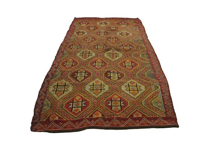 Deze handgeweven vintage kelim is gemaakt in de jaren 70-80 door nomaden in het dorp Mersin. Voordat ze met het weven begon, was de wever haar schapen aan het scheren, de wol aan het schoonmaken, kammen en spinnen om het beste kelimgaren te krijgen. Het weven van tapijten is een traditie in Turkije en elk dorp en elke stam heeft een andere ontwerp- en weeftraditie. Dit vloerkleed heeft karakteristieke kleuren & design combinatie.
